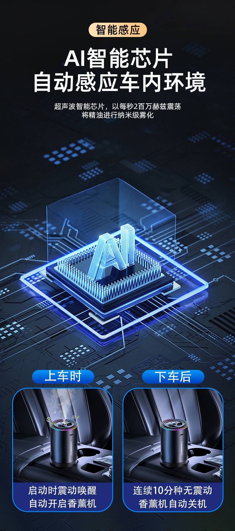 7. Интеллектуальный сенсорный интеллектуальный чип AI автоматически распознает ультразвуковой интеллектуальный чип в среде автомобиля и распыляет эфирные масла на наноуровне с вибрацией 2 миллиона герц в секунду.
